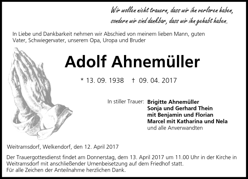 Hier finden Sie alle Traueranzeigen aus der Zeitung, die bisher für Adolf Ahnemüller erschienen sind. Weitere Traueranzeigen, die in der Zeitung erscheinen, werden hier ebenfalls aufgelistet