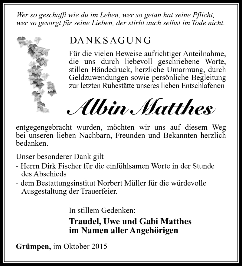 Hier finden Sie alle Traueranzeigen aus der Zeitung, die bisher für Albin Matthes erschienen sind. Weitere Traueranzeigen, die in der Zeitung erscheinen, werden hier ebenfalls aufgelistet