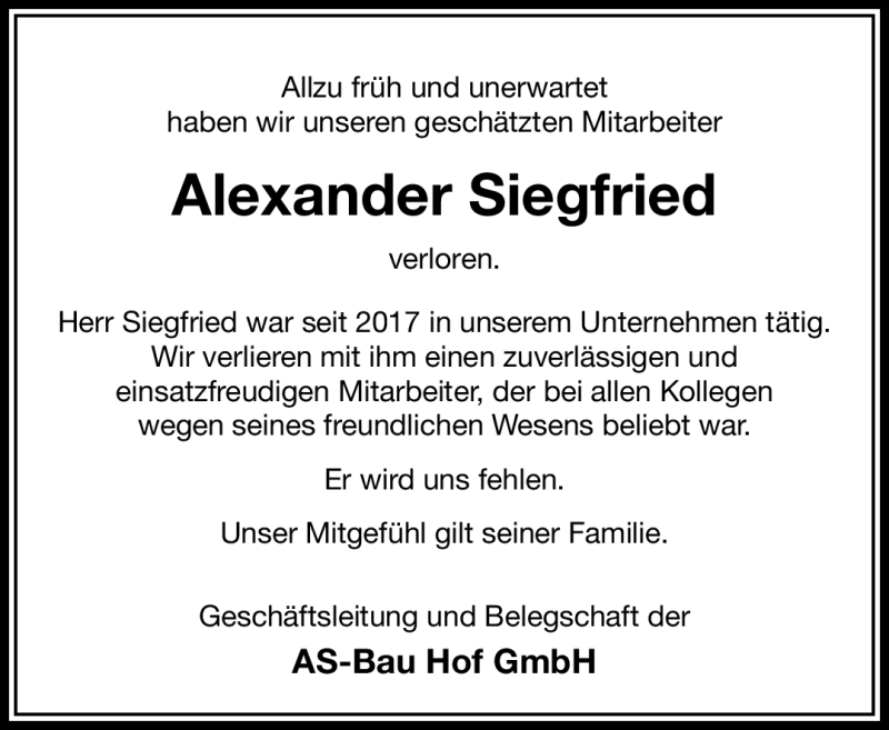 Hier finden Sie alle Traueranzeigen aus der Zeitung, die bisher für Alexander Siegfried erschienen sind. Weitere Traueranzeigen, die in der Zeitung erscheinen, werden hier ebenfalls aufgelistet