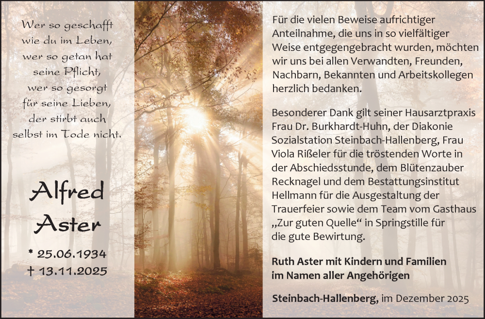 Hier finden Sie alle Traueranzeigen aus der Zeitung, die bisher für Alfred Aster erschienen sind. Weitere Traueranzeigen, die in der Zeitung erscheinen, werden hier ebenfalls aufgelistet
