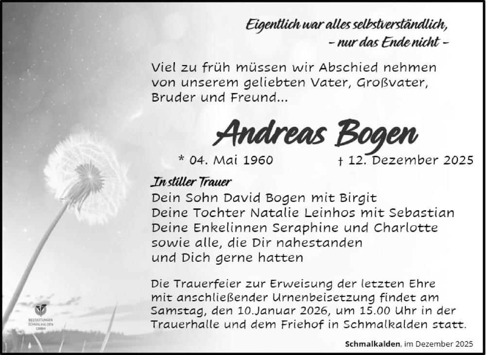 Hier finden Sie alle Traueranzeigen aus der Zeitung, die bisher für Andreas Bogen erschienen sind. Weitere Traueranzeigen, die in der Zeitung erscheinen, werden hier ebenfalls aufgelistet