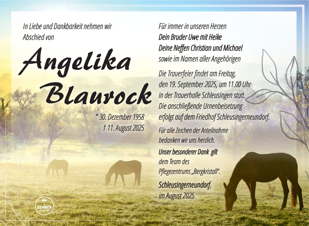 Hier finden Sie alle Traueranzeigen aus der Zeitung, die bisher für Angelika Blaurock erschienen sind. Weitere Traueranzeigen, die in der Zeitung erscheinen, werden hier ebenfalls aufgelistet