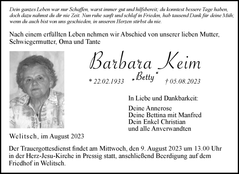 Hier finden Sie alle Traueranzeigen aus der Zeitung, die bisher für Barbara Keim erschienen sind. Weitere Traueranzeigen, die in der Zeitung erscheinen, werden hier ebenfalls aufgelistet