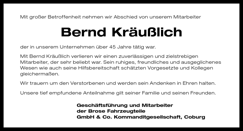 Hier finden Sie alle Traueranzeigen aus der Zeitung, die bisher für Bernd Kräußlich erschienen sind. Weitere Traueranzeigen, die in der Zeitung erscheinen, werden hier ebenfalls aufgelistet