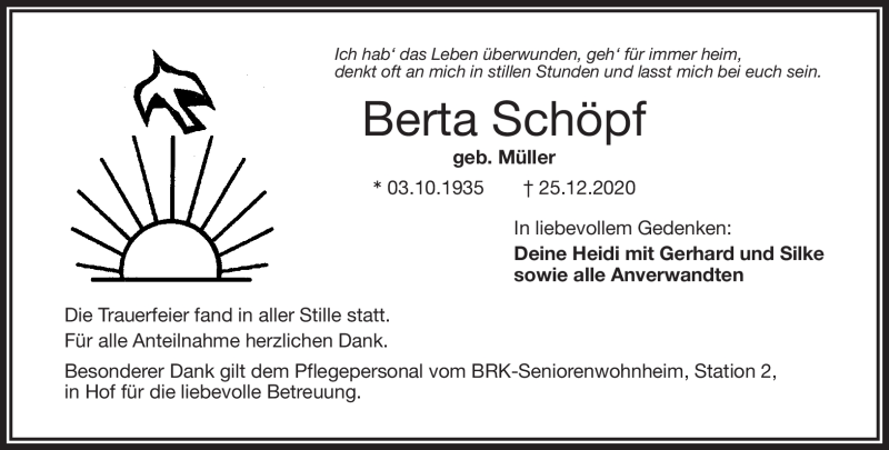 Hier finden Sie alle Traueranzeigen aus der Zeitung, die bisher für Berta Schöpf erschienen sind. Weitere Traueranzeigen, die in der Zeitung erscheinen, werden hier ebenfalls aufgelistet
