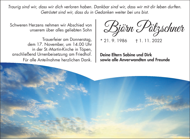 Hier finden Sie alle Traueranzeigen aus der Zeitung, die bisher für Björn Pötzschner erschienen sind. Weitere Traueranzeigen, die in der Zeitung erscheinen, werden hier ebenfalls aufgelistet