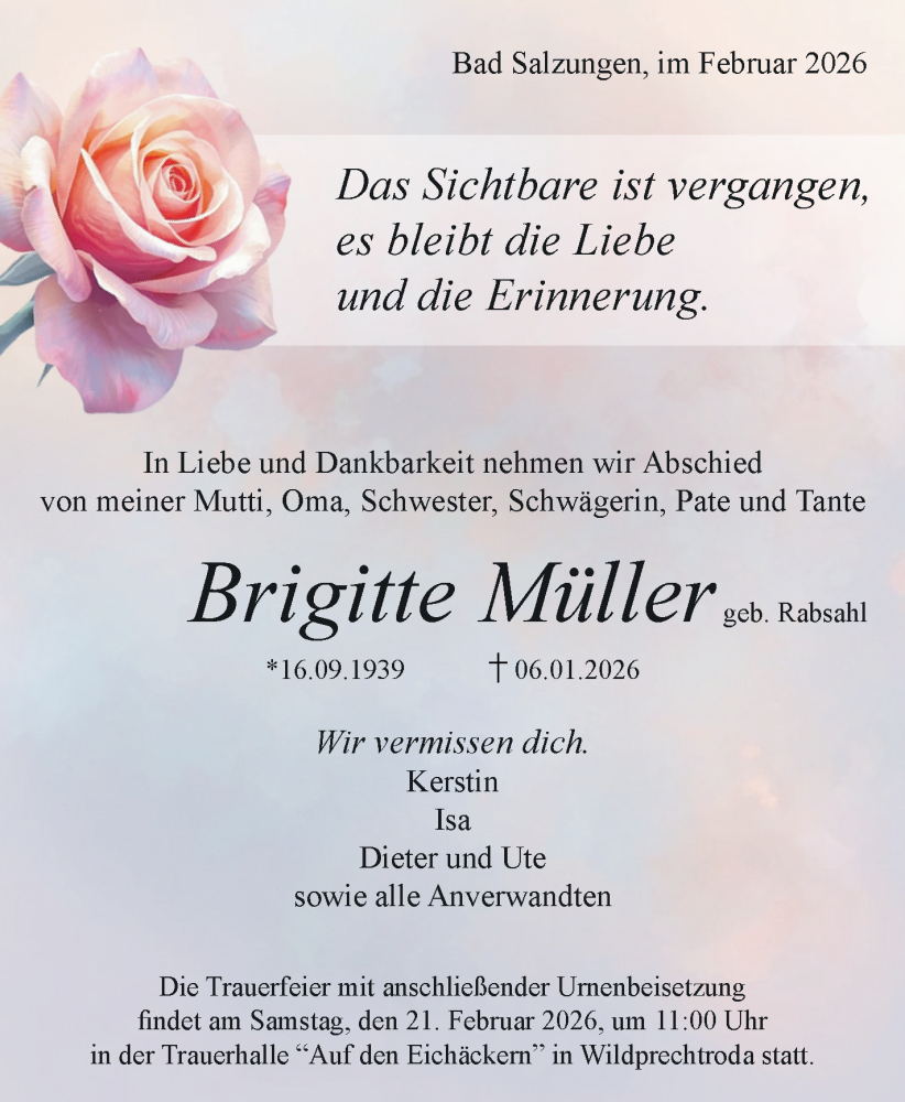 Hier finden Sie alle Traueranzeigen aus der Zeitung, die bisher für Brigitte Müller erschienen sind. Weitere Traueranzeigen, die in der Zeitung erscheinen, werden hier ebenfalls aufgelistet