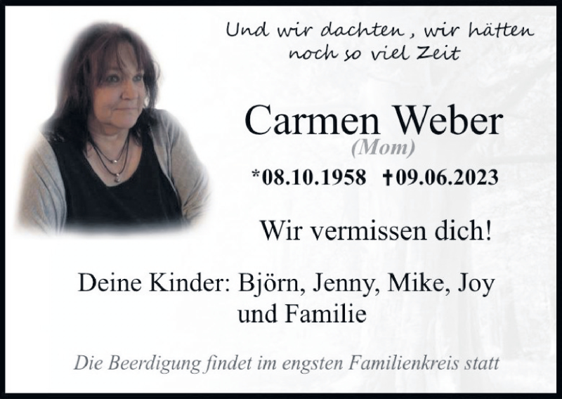 Hier finden Sie alle Traueranzeigen aus der Zeitung, die bisher für Carmen Weber erschienen sind. Weitere Traueranzeigen, die in der Zeitung erscheinen, werden hier ebenfalls aufgelistet