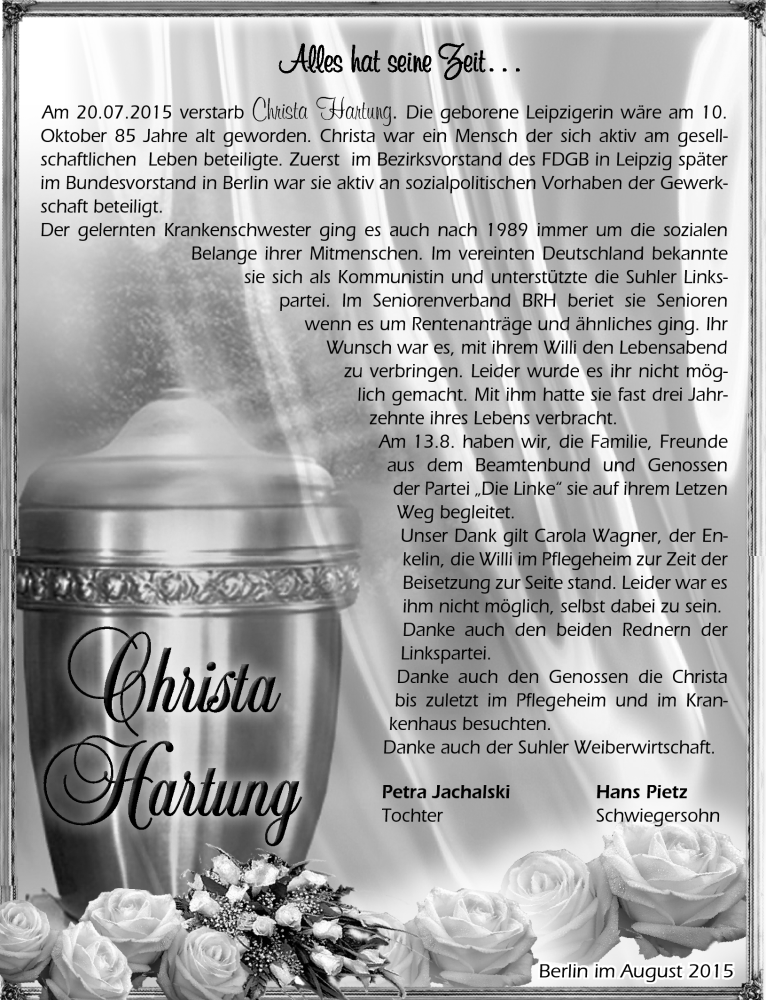 Hier finden Sie alle Traueranzeigen aus der Zeitung, die bisher für Christa Hartung erschienen sind. Weitere Traueranzeigen, die in der Zeitung erscheinen, werden hier ebenfalls aufgelistet