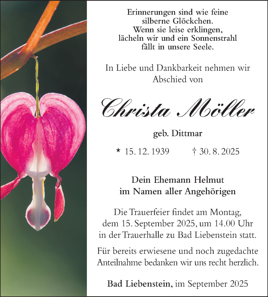 Hier finden Sie alle Traueranzeigen aus der Zeitung, die bisher für Christa Möller erschienen sind. Weitere Traueranzeigen, die in der Zeitung erscheinen, werden hier ebenfalls aufgelistet