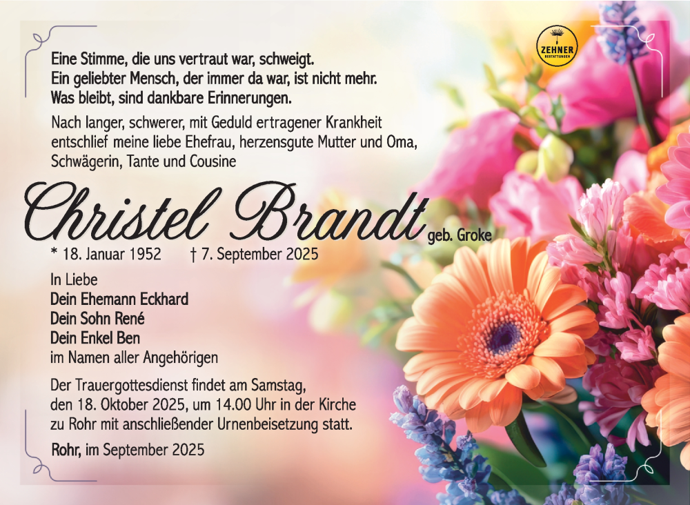 Hier finden Sie alle Traueranzeigen aus der Zeitung, die bisher für Christel Brandt erschienen sind. Weitere Traueranzeigen, die in der Zeitung erscheinen, werden hier ebenfalls aufgelistet