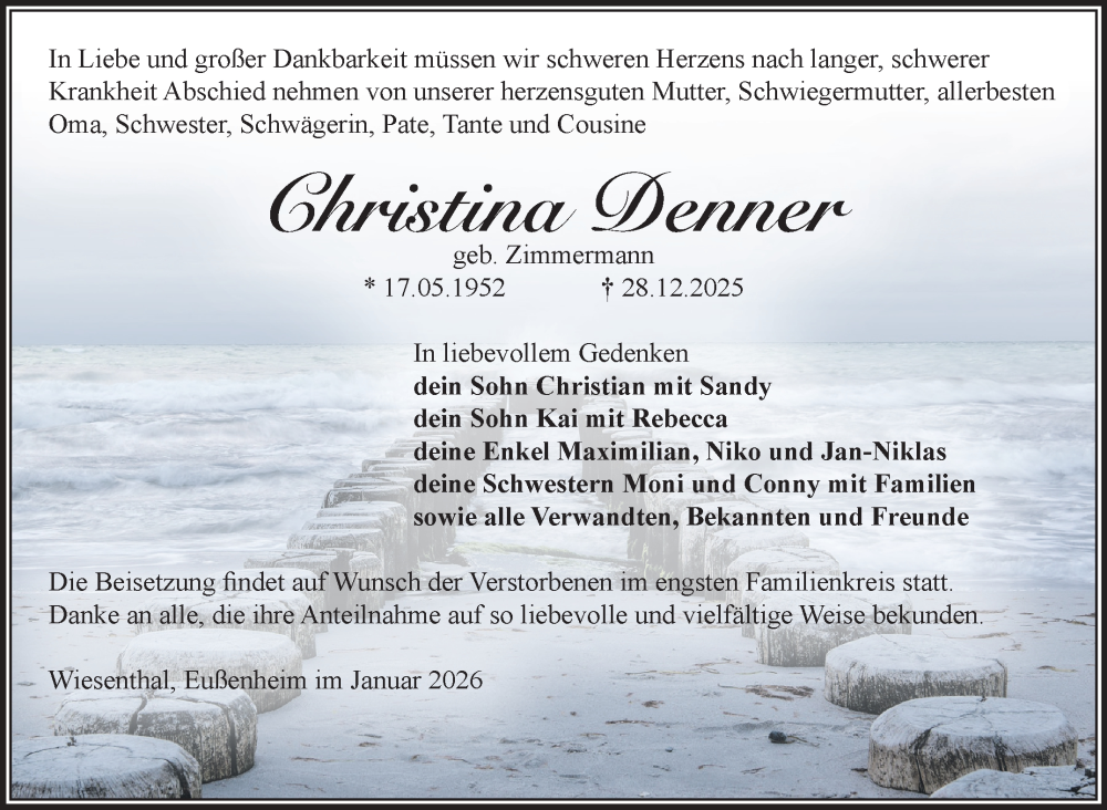 Hier finden Sie alle Traueranzeigen aus der Zeitung, die bisher für Christina Denner erschienen sind. Weitere Traueranzeigen, die in der Zeitung erscheinen, werden hier ebenfalls aufgelistet