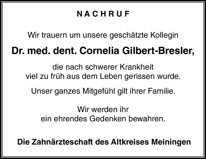 Hier finden Sie alle Traueranzeigen aus der Zeitung, die bisher für Cornelia Gilbert-Bresler erschienen sind. Weitere Traueranzeigen, die in der Zeitung erscheinen, werden hier ebenfalls aufgelistet