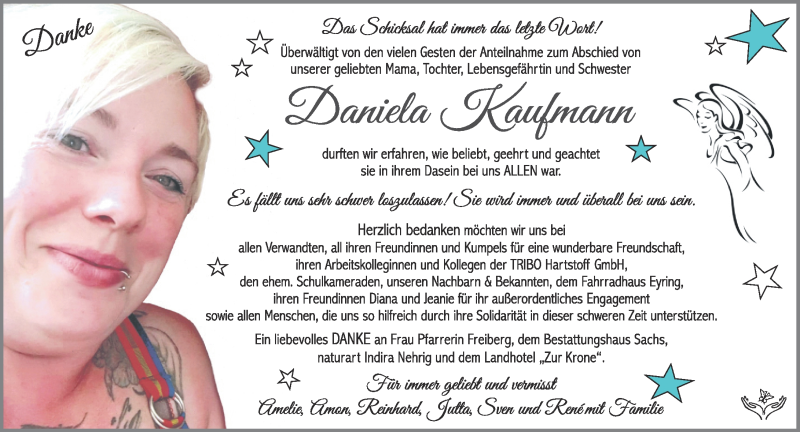 Hier finden Sie alle Traueranzeigen aus der Zeitung, die bisher für Daniela Kaufmann erschienen sind. Weitere Traueranzeigen, die in der Zeitung erscheinen, werden hier ebenfalls aufgelistet