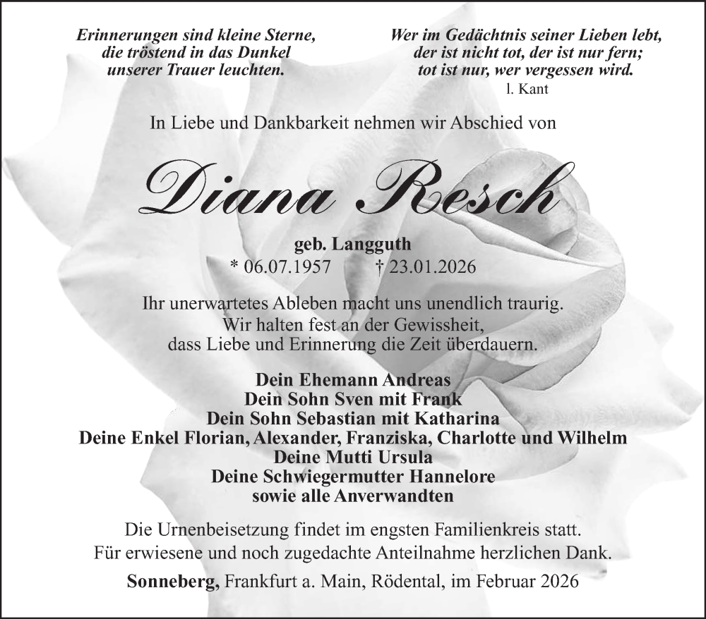 Hier finden Sie alle Traueranzeigen aus der Zeitung, die bisher für Diana Resch erschienen sind. Weitere Traueranzeigen, die in der Zeitung erscheinen, werden hier ebenfalls aufgelistet