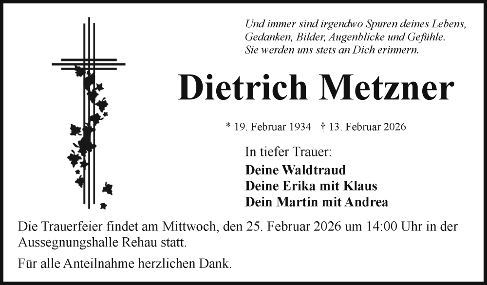 Hier finden Sie alle Traueranzeigen aus der Zeitung, die bisher für Dietrich Metzner erschienen sind. Weitere Traueranzeigen, die in der Zeitung erscheinen, werden hier ebenfalls aufgelistet