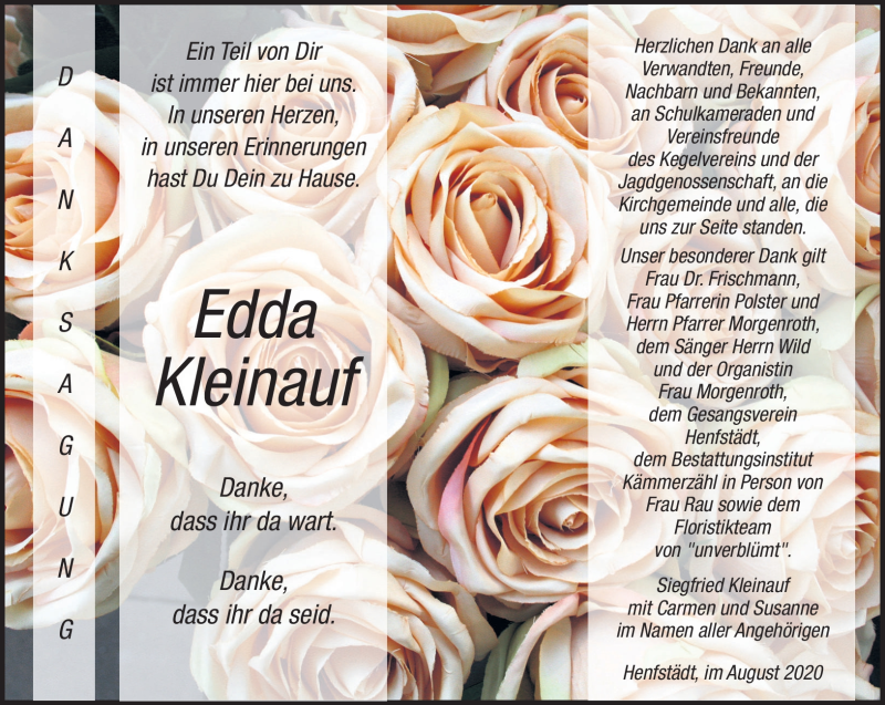 Hier finden Sie alle Traueranzeigen aus der Zeitung, die bisher für Edda Kleinauf erschienen sind. Weitere Traueranzeigen, die in der Zeitung erscheinen, werden hier ebenfalls aufgelistet