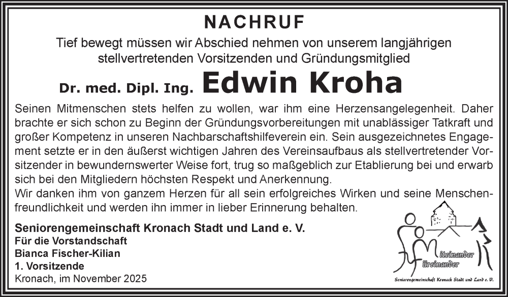 Hier finden Sie alle Traueranzeigen aus der Zeitung, die bisher für Edwin Kroha erschienen sind. Weitere Traueranzeigen, die in der Zeitung erscheinen, werden hier ebenfalls aufgelistet
