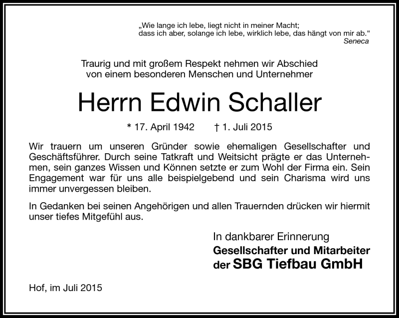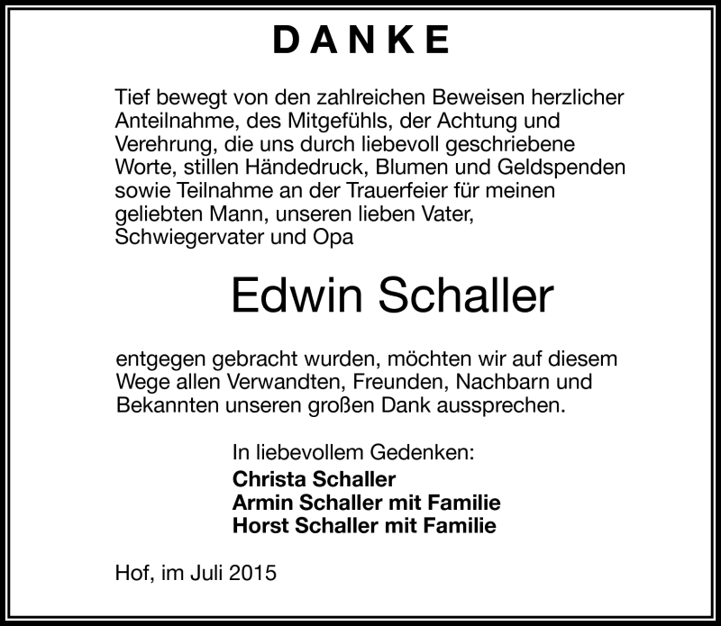 Hier finden Sie alle Traueranzeigen aus der Zeitung, die bisher für Edwin Schaller erschienen sind. Weitere Traueranzeigen, die in der Zeitung erscheinen, werden hier ebenfalls aufgelistet