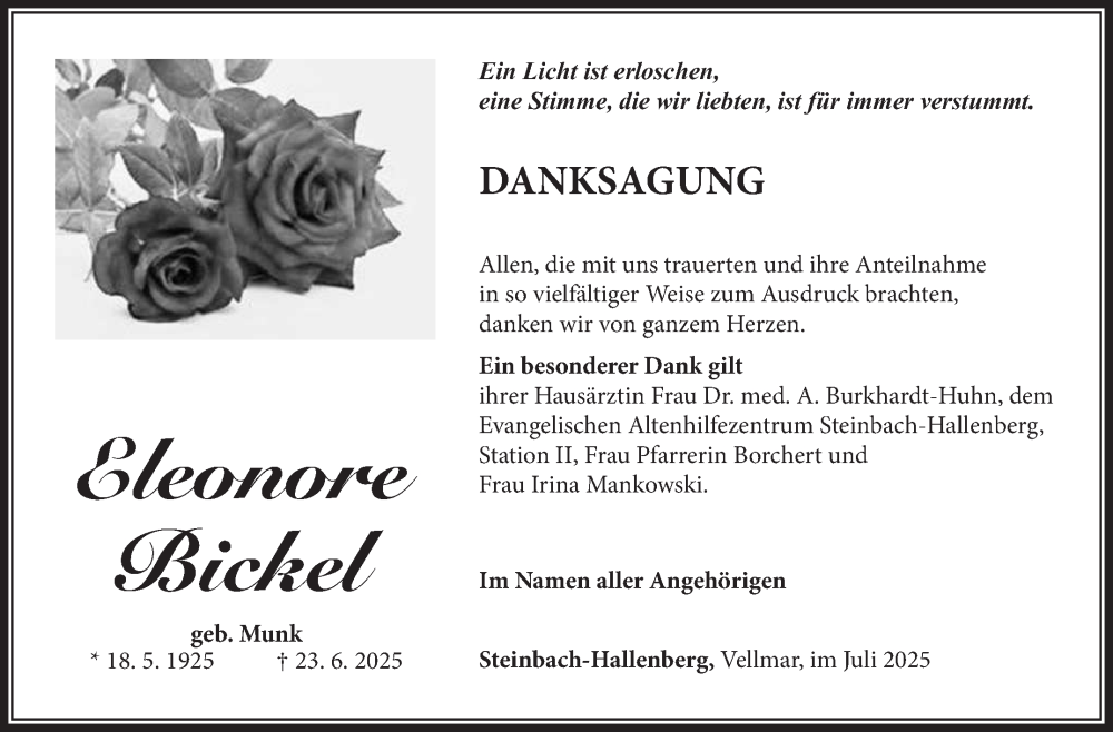 Hier finden Sie alle Traueranzeigen aus der Zeitung, die bisher für Eleonore Bickel erschienen sind. Weitere Traueranzeigen, die in der Zeitung erscheinen, werden hier ebenfalls aufgelistet