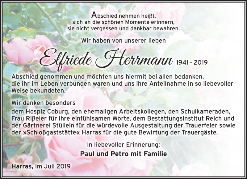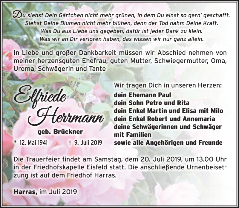 Hier finden Sie alle Traueranzeigen aus der Zeitung, die bisher für Elfriede Herrmann erschienen sind. Weitere Traueranzeigen, die in der Zeitung erscheinen, werden hier ebenfalls aufgelistet
