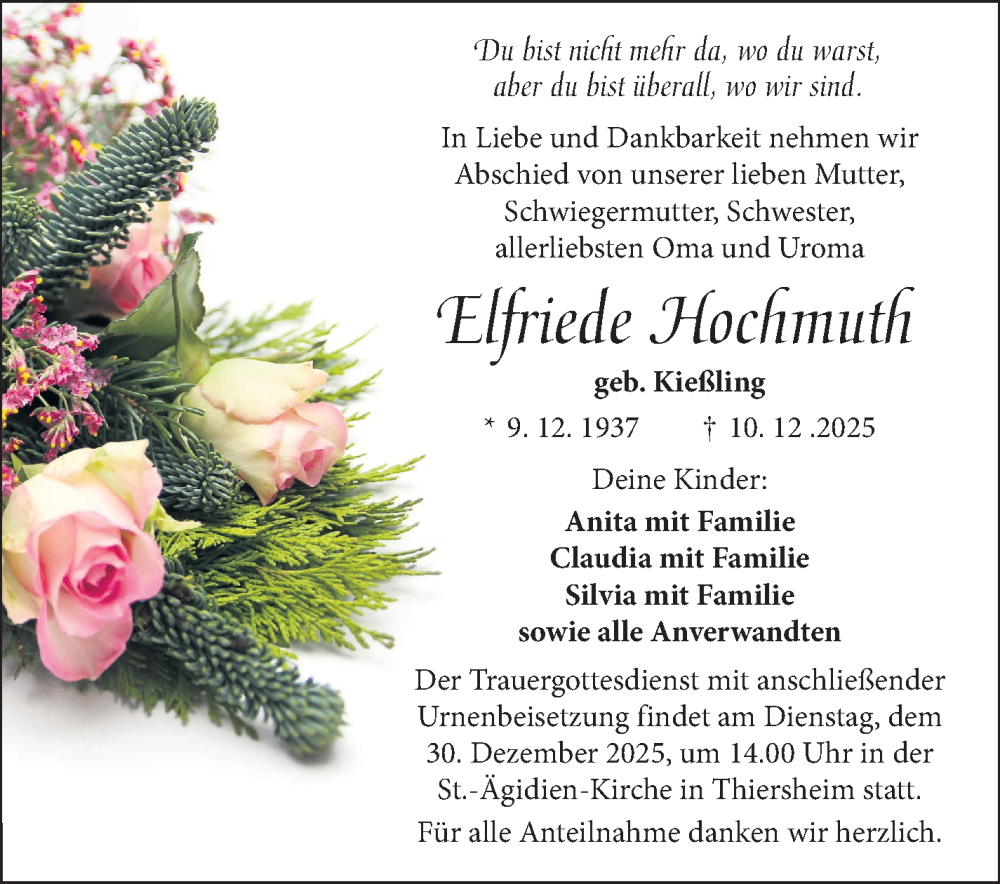 Hier finden Sie alle Traueranzeigen aus der Zeitung, die bisher für Elfriede Hochmuth erschienen sind. Weitere Traueranzeigen, die in der Zeitung erscheinen, werden hier ebenfalls aufgelistet