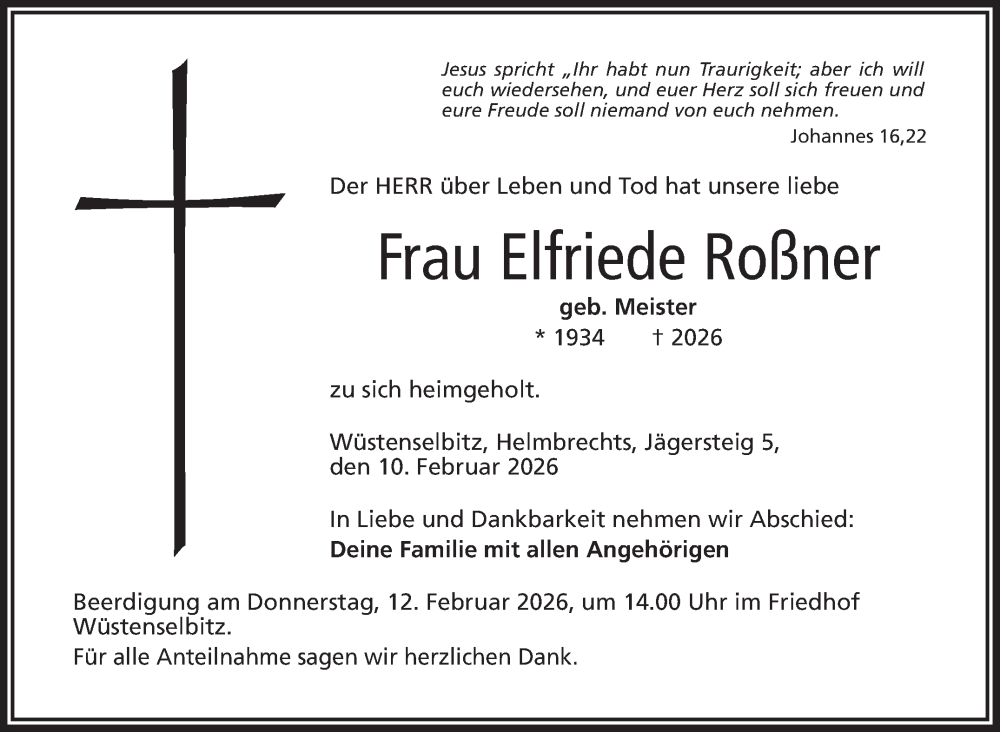 Hier finden Sie alle Traueranzeigen aus der Zeitung, die bisher für Elfriede Roßner erschienen sind. Weitere Traueranzeigen, die in der Zeitung erscheinen, werden hier ebenfalls aufgelistet