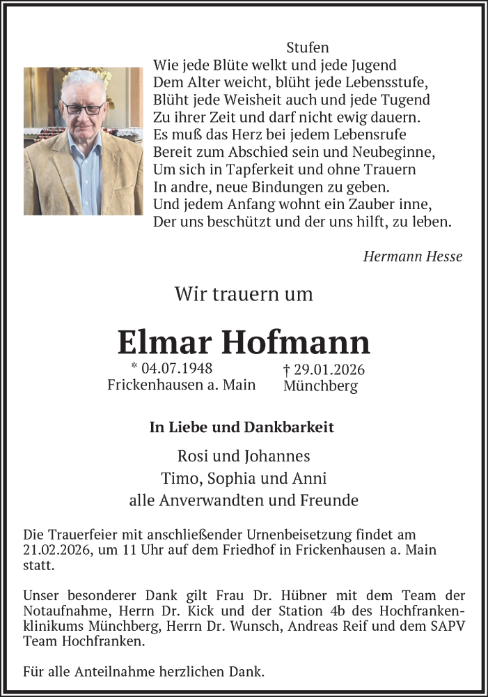 Hier finden Sie alle Traueranzeigen aus der Zeitung, die bisher für Elmar Hofmann erschienen sind. Weitere Traueranzeigen, die in der Zeitung erscheinen, werden hier ebenfalls aufgelistet