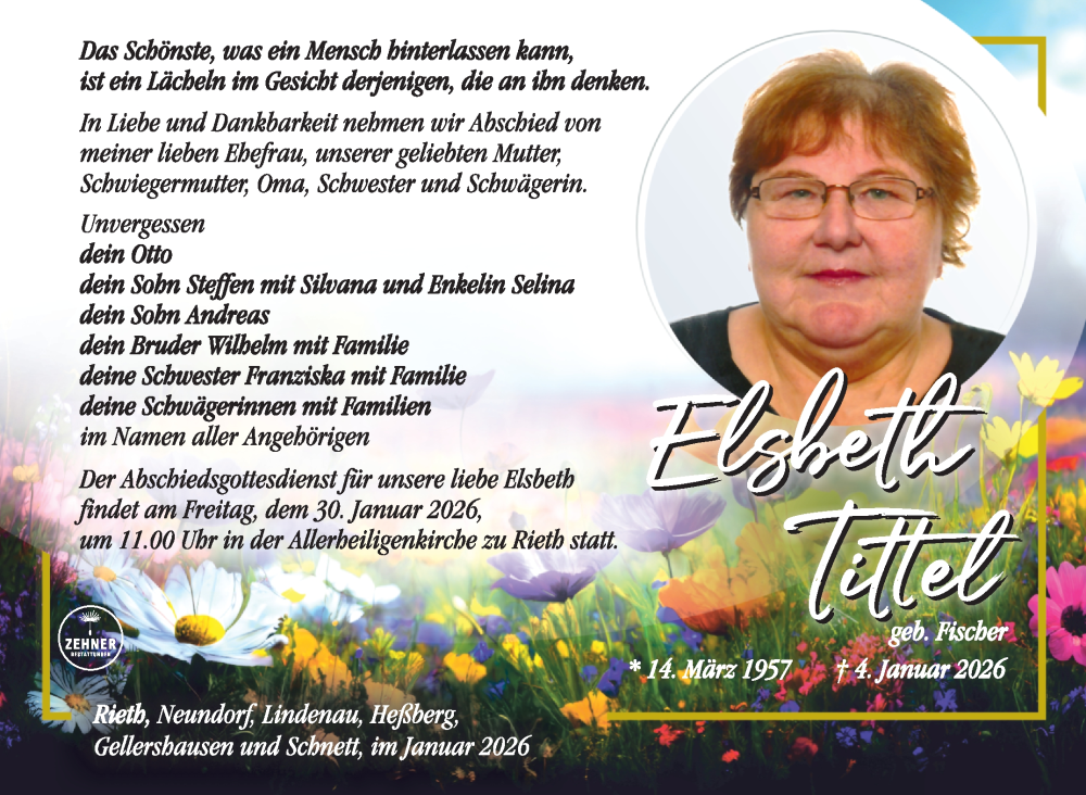 Hier finden Sie alle Traueranzeigen aus der Zeitung, die bisher für Elsbeth Tittel erschienen sind. Weitere Traueranzeigen, die in der Zeitung erscheinen, werden hier ebenfalls aufgelistet