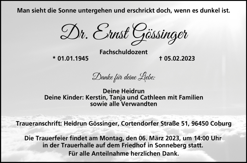 Hier finden Sie alle Traueranzeigen aus der Zeitung, die bisher für Ernst Gössinger erschienen sind. Weitere Traueranzeigen, die in der Zeitung erscheinen, werden hier ebenfalls aufgelistet