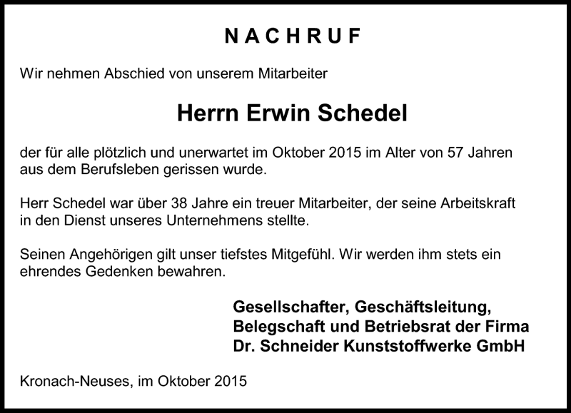Hier finden Sie alle Traueranzeigen aus der Zeitung, die bisher für Erwin Schedel erschienen sind. Weitere Traueranzeigen, die in der Zeitung erscheinen, werden hier ebenfalls aufgelistet