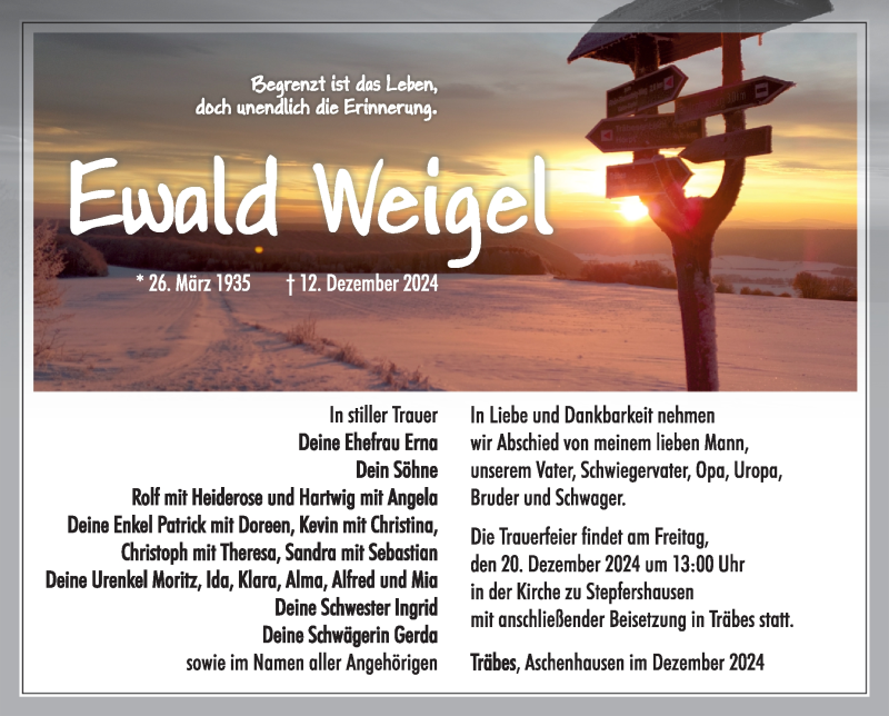 Hier finden Sie alle Traueranzeigen aus der Zeitung, die bisher für Ewald Weigel erschienen sind. Weitere Traueranzeigen, die in der Zeitung erscheinen, werden hier ebenfalls aufgelistet