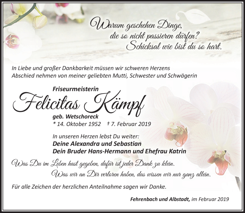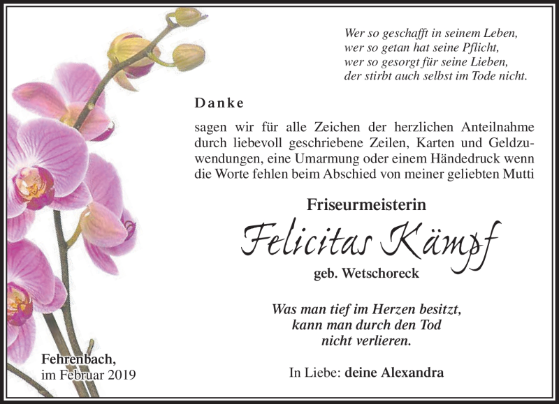 Hier finden Sie alle Traueranzeigen aus der Zeitung, die bisher für Felicitas Kämpf erschienen sind. Weitere Traueranzeigen, die in der Zeitung erscheinen, werden hier ebenfalls aufgelistet