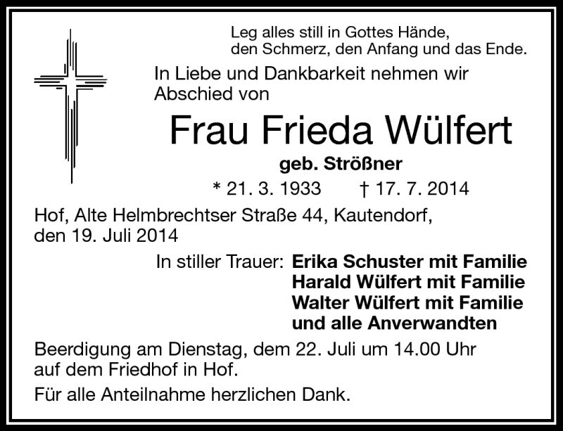 Hier finden Sie alle Traueranzeigen aus der Zeitung, die bisher für Frieda Wülfert erschienen sind. Weitere Traueranzeigen, die in der Zeitung erscheinen, werden hier ebenfalls aufgelistet