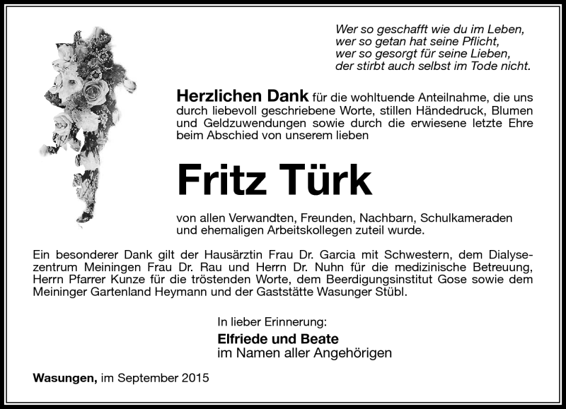 Hier finden Sie alle Traueranzeigen aus der Zeitung, die bisher für Fritz Türk erschienen sind. Weitere Traueranzeigen, die in der Zeitung erscheinen, werden hier ebenfalls aufgelistet