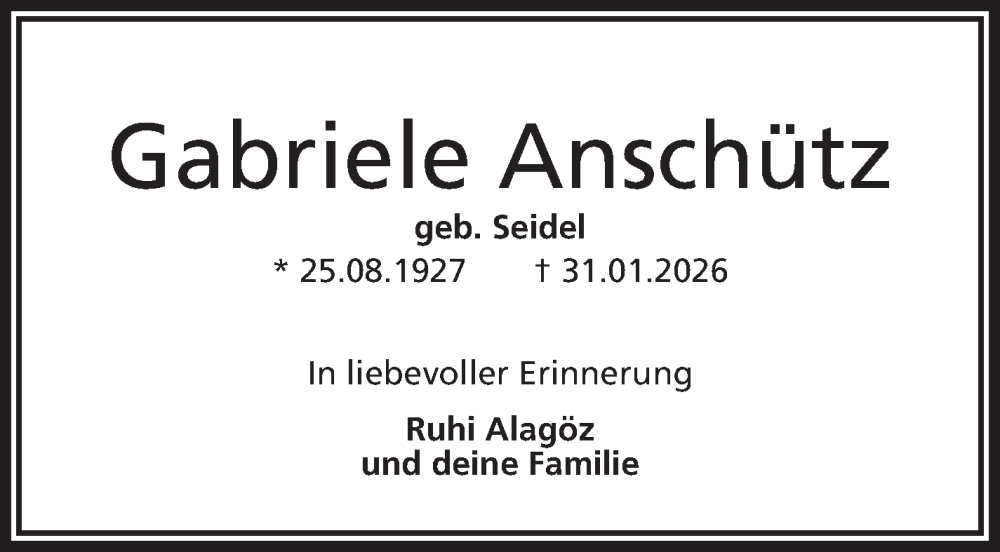 Hier finden Sie alle Traueranzeigen aus der Zeitung, die bisher für Gabriele Anschütz erschienen sind. Weitere Traueranzeigen, die in der Zeitung erscheinen, werden hier ebenfalls aufgelistet
