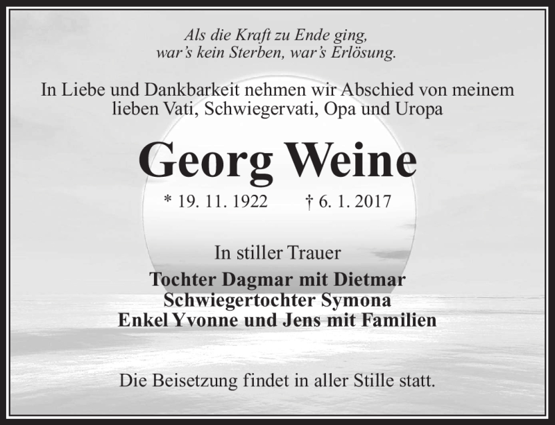 Hier finden Sie alle Traueranzeigen aus der Zeitung, die bisher für Georg Weine erschienen sind. Weitere Traueranzeigen, die in der Zeitung erscheinen, werden hier ebenfalls aufgelistet