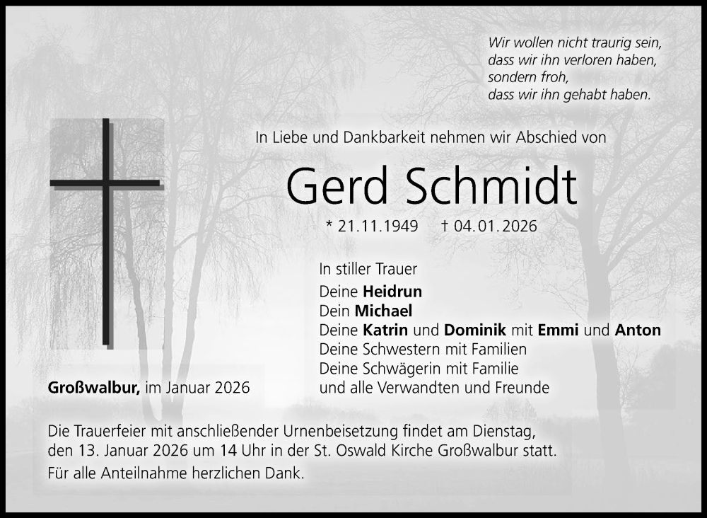 Hier finden Sie alle Traueranzeigen aus der Zeitung, die bisher für Gerd Schmidt erschienen sind. Weitere Traueranzeigen, die in der Zeitung erscheinen, werden hier ebenfalls aufgelistet