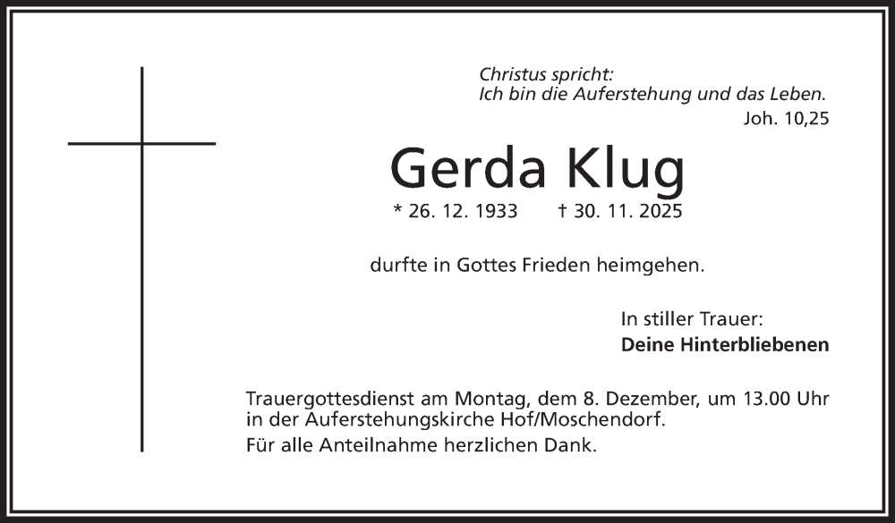 Hier finden Sie alle Traueranzeigen aus der Zeitung, die bisher für Gerda Klug erschienen sind. Weitere Traueranzeigen, die in der Zeitung erscheinen, werden hier ebenfalls aufgelistet