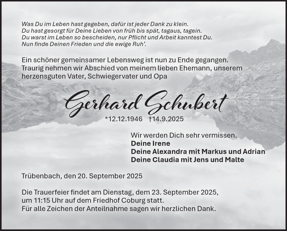 Hier finden Sie alle Traueranzeigen aus der Zeitung, die bisher für Gerhard Schubert erschienen sind. Weitere Traueranzeigen, die in der Zeitung erscheinen, werden hier ebenfalls aufgelistet