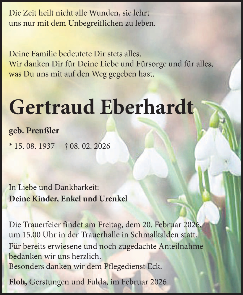 Hier finden Sie alle Traueranzeigen aus der Zeitung, die bisher für Gertraud Eberhardt erschienen sind. Weitere Traueranzeigen, die in der Zeitung erscheinen, werden hier ebenfalls aufgelistet