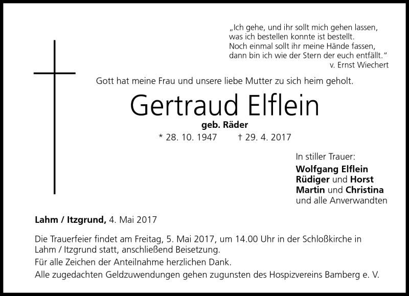 Hier finden Sie alle Traueranzeigen aus der Zeitung, die bisher für Gertraud Elflein erschienen sind. Weitere Traueranzeigen, die in der Zeitung erscheinen, werden hier ebenfalls aufgelistet