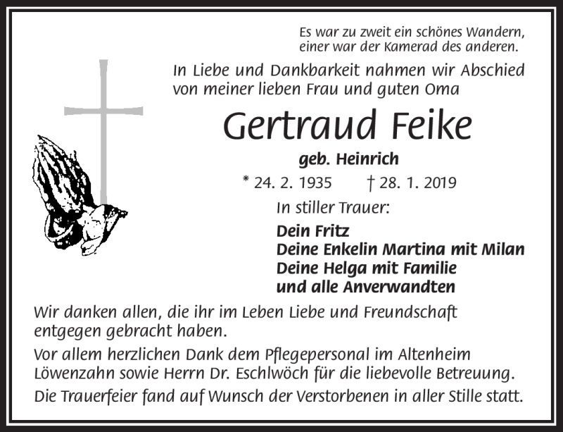 Hier finden Sie alle Traueranzeigen aus der Zeitung, die bisher für Gertraud Feike erschienen sind. Weitere Traueranzeigen, die in der Zeitung erscheinen, werden hier ebenfalls aufgelistet