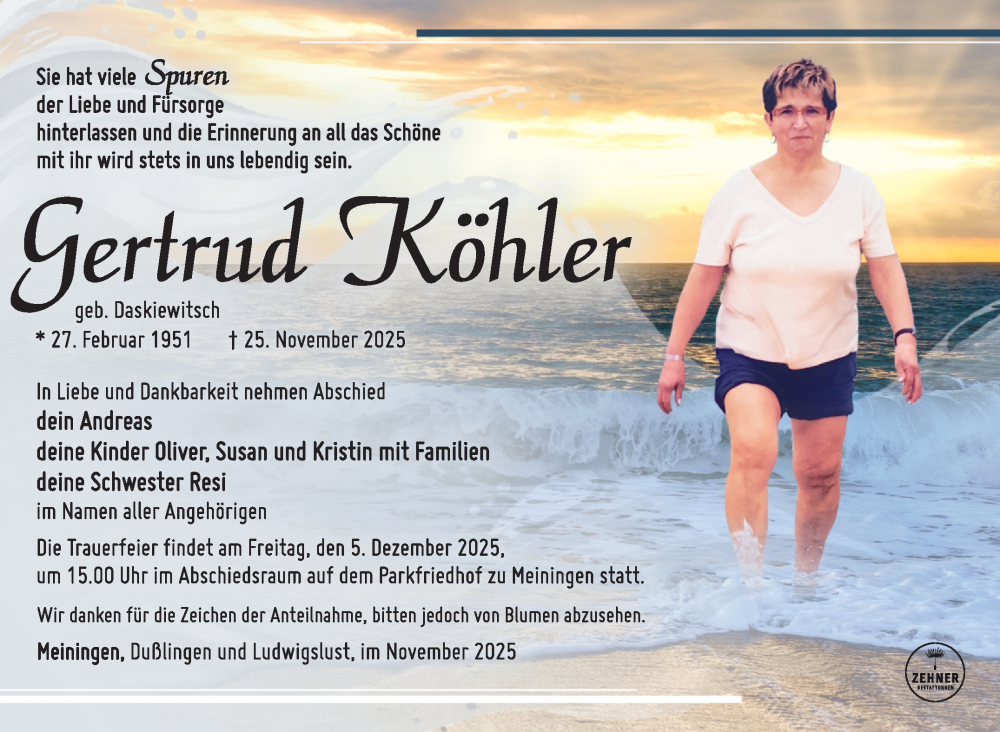 Hier finden Sie alle Traueranzeigen aus der Zeitung, die bisher für Gertraud Köhler erschienen sind. Weitere Traueranzeigen, die in der Zeitung erscheinen, werden hier ebenfalls aufgelistet
