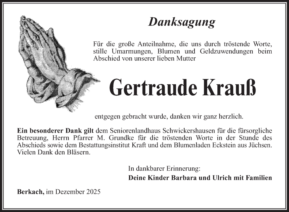 Hier finden Sie alle Traueranzeigen aus der Zeitung, die bisher für Gertraude Krauß erschienen sind. Weitere Traueranzeigen, die in der Zeitung erscheinen, werden hier ebenfalls aufgelistet