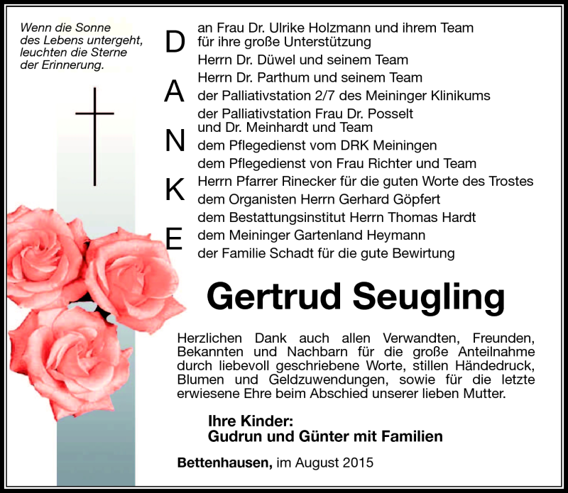 Hier finden Sie alle Traueranzeigen aus der Zeitung, die bisher für Gertrud Seugling erschienen sind. Weitere Traueranzeigen, die in der Zeitung erscheinen, werden hier ebenfalls aufgelistet