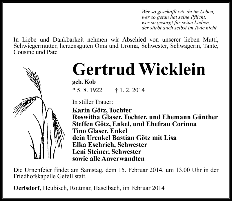 Hier finden Sie alle Traueranzeigen aus der Zeitung, die bisher für Gertrud Wicklein erschienen sind. Weitere Traueranzeigen, die in der Zeitung erscheinen, werden hier ebenfalls aufgelistet