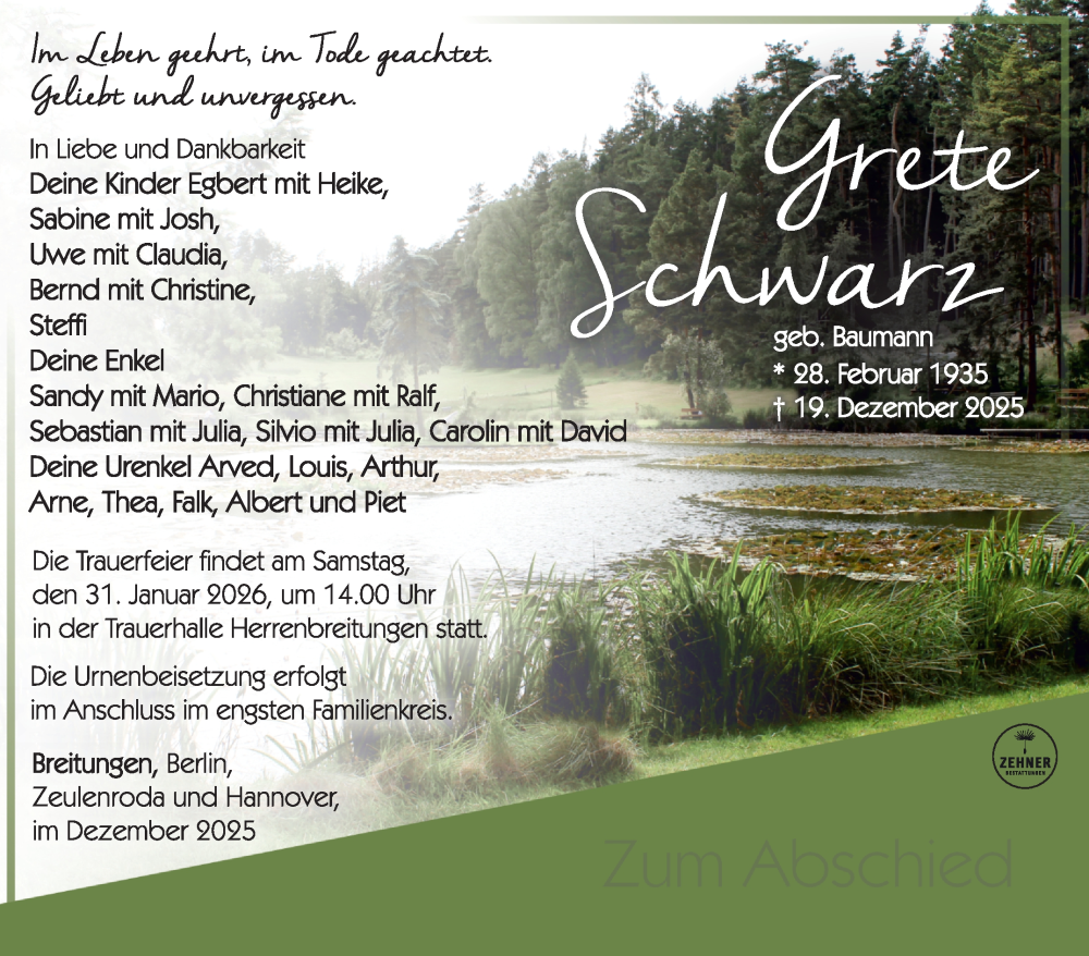 Hier finden Sie alle Traueranzeigen aus der Zeitung, die bisher für Grete Schwarz erschienen sind. Weitere Traueranzeigen, die in der Zeitung erscheinen, werden hier ebenfalls aufgelistet