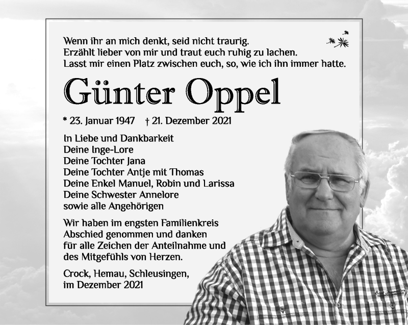 Hier finden Sie alle Traueranzeigen aus der Zeitung, die bisher für Günter Oppel erschienen sind. Weitere Traueranzeigen, die in der Zeitung erscheinen, werden hier ebenfalls aufgelistet