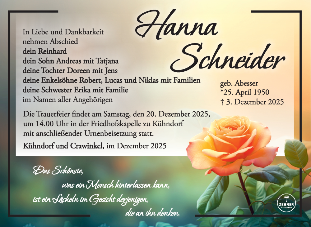 Hier finden Sie alle Traueranzeigen aus der Zeitung, die bisher für Hanna Schneider erschienen sind. Weitere Traueranzeigen, die in der Zeitung erscheinen, werden hier ebenfalls aufgelistet